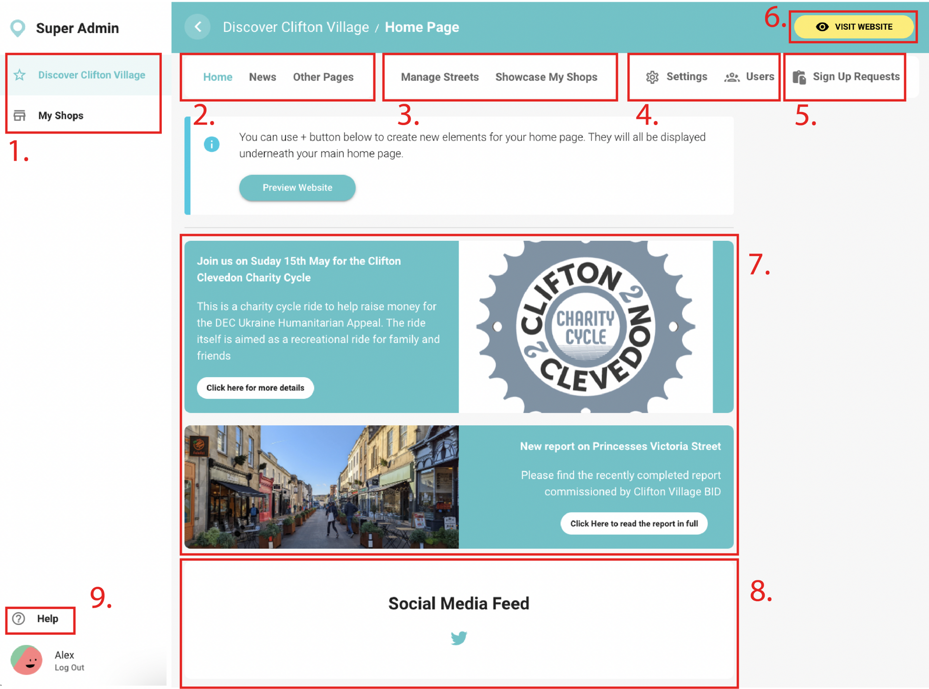 Once you have logged in, you will be taken to this screen which is your community manager dashboard. This section gives a brief overview of your dashboard controls, there will be more information on each individual control in the following sections.