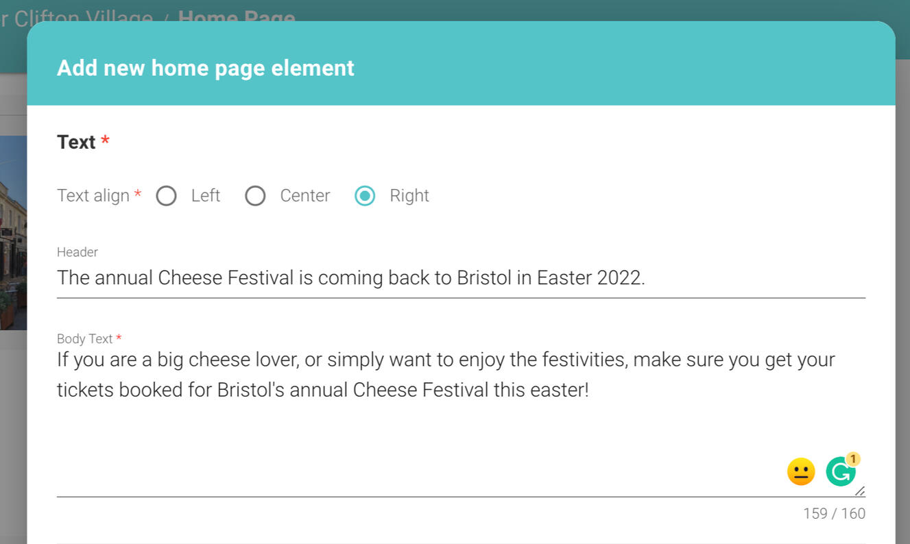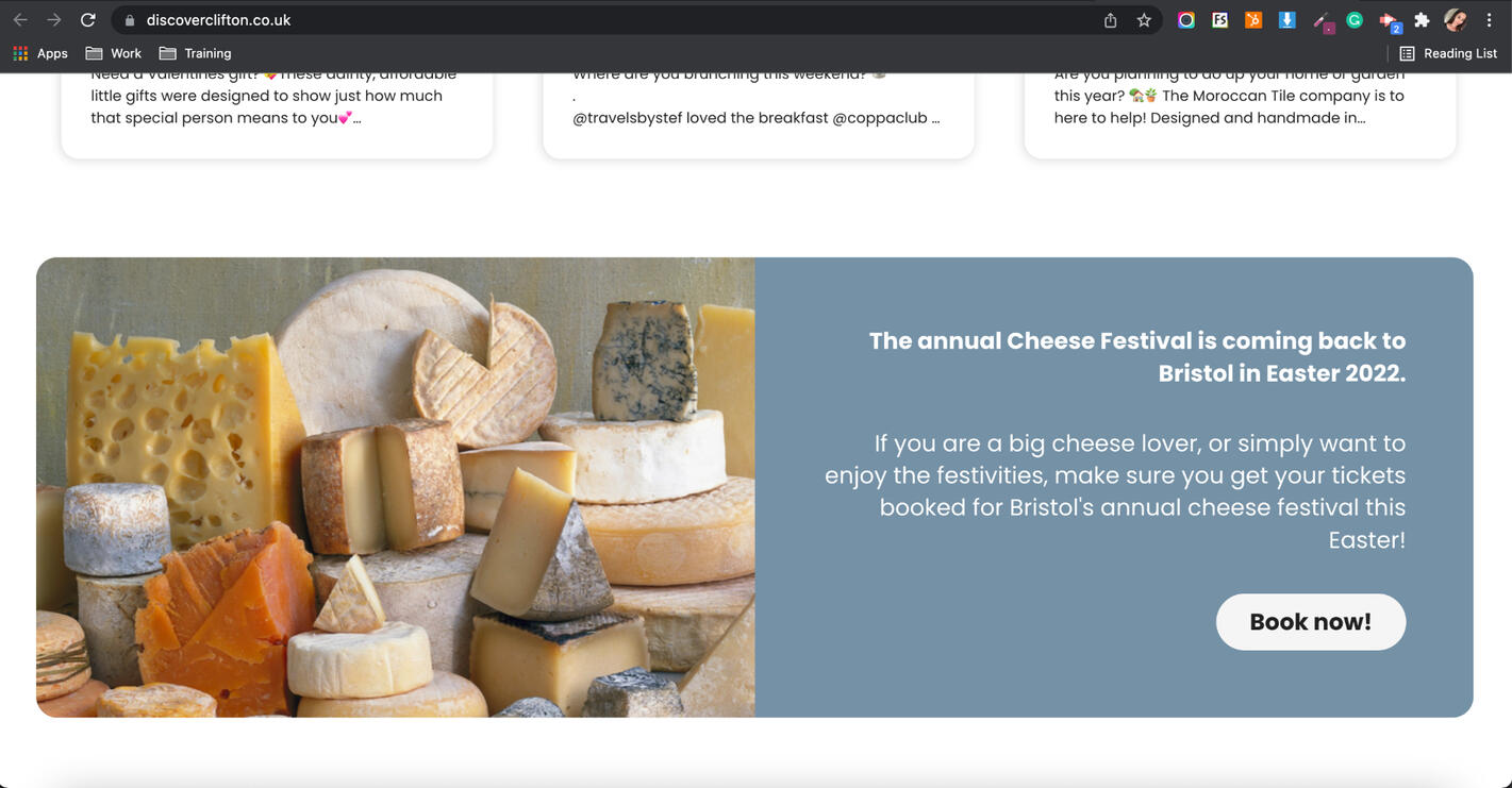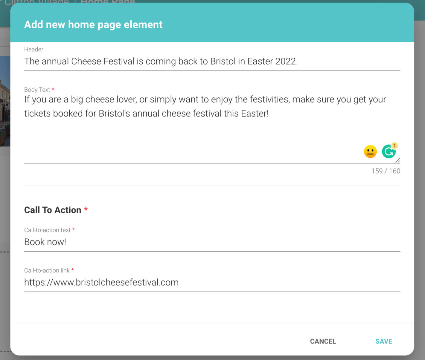 4. Call to action Scroll down even further and you will find the Call To Action section. The Call To Action Text is essentially going to be a button that enables a hyperlink, so fill it in with text like "Book now!", "Shop now!" or whatever may be relevant to your post. In this instance, I want the readers to book tickets to the cheese festival so I have put "Book now!"Now, you can put the website address that you wish to send visitors to within Call To Action Link. This is where they will be taken to when they click on your Call To Action Text.Finally, click save and your Call To Action Homepage Element is finished!