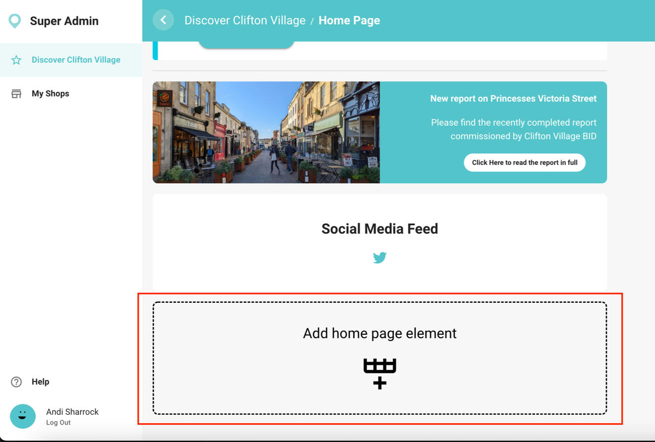 1. Click on the Add New Homepage Element button. When you are on your homepage, select 'Add Homepage Element' in order to begin creating a new homepage element. If you have a few homepage elements already you may need to scroll down to find this.