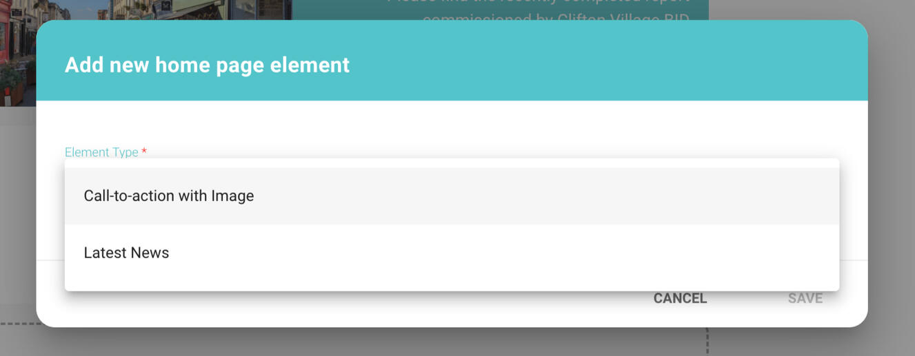2. Select whether you want your new homepage element to be either a Call To Action With Image or Latest News.A Call To Action With Image, means you will be able to create a new homepage element with a button that links to an exterior website. For example, you may use a call to action element with an image to redirect customers for an event to a specific website that sells tickets.Latest News means that you will be using the homepage to advertise a post that has already been created on your news page. You will need to have already posted a news item under your news page in order to do this.