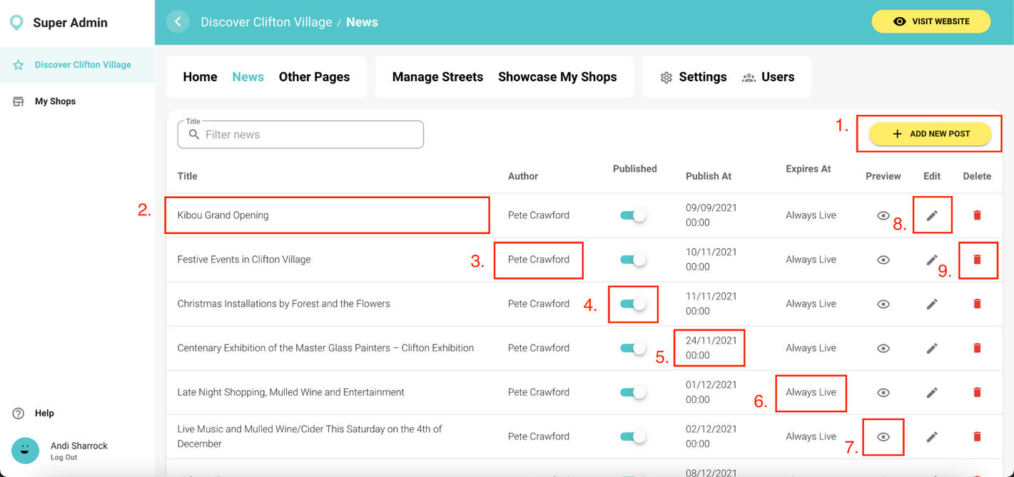 1 Add New Post. To edit an existing news post, simply click on this yellow Add New Post button.